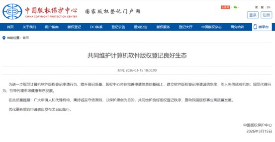 自2026年3月15日起,正式启用优化更新后的计算机软件著作权登记申请表,旧版申请表即日起废止,使用旧版申请表提交的登记申请,中心将不予受理。